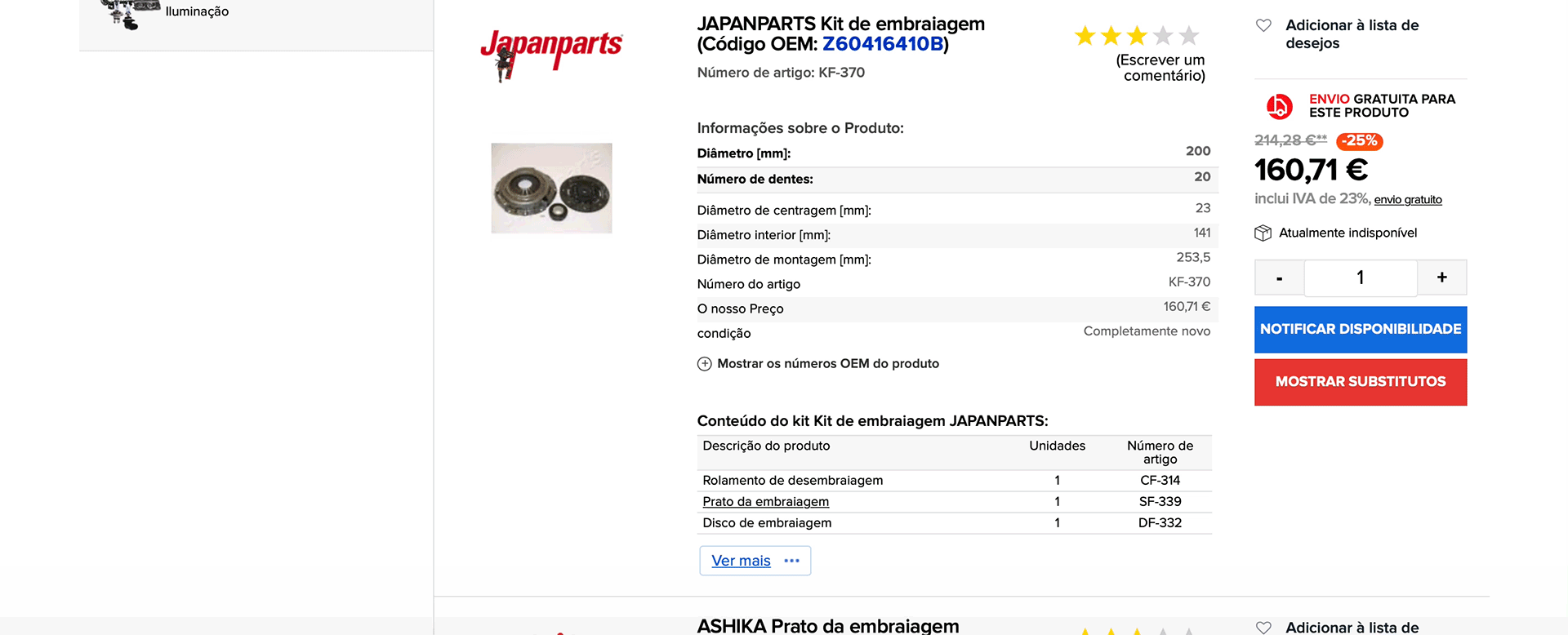 Uma lista de artigos alternativos será apresentada, se pesquisar por peças através do número OEM. Um artigo alternativo é um artigo, que apresenta características semelhantes ou idênticas. Logo após ter introduzido o número OEM, certifique-se de comparar as características dos artigos alternativos apresentadas na lista. No caso de existirem vários resultados de pesquisa, leia atentamente e compare as características dos artigos alternativos com o seu artigo original, ou contacte o serviço de apoio ao cliente para obter ajuda. Se a peça de reposição de que necessita estiver esgotada, utilize o botão "Mostrar substitutos". Poderá ver uma lista de artigos com características semelhantes ou idênticas, porém de outras marcas, e possivelmente em diferentes categorias de preço.